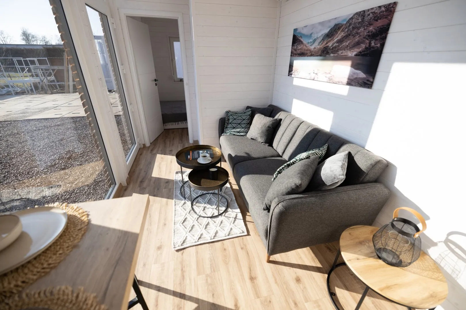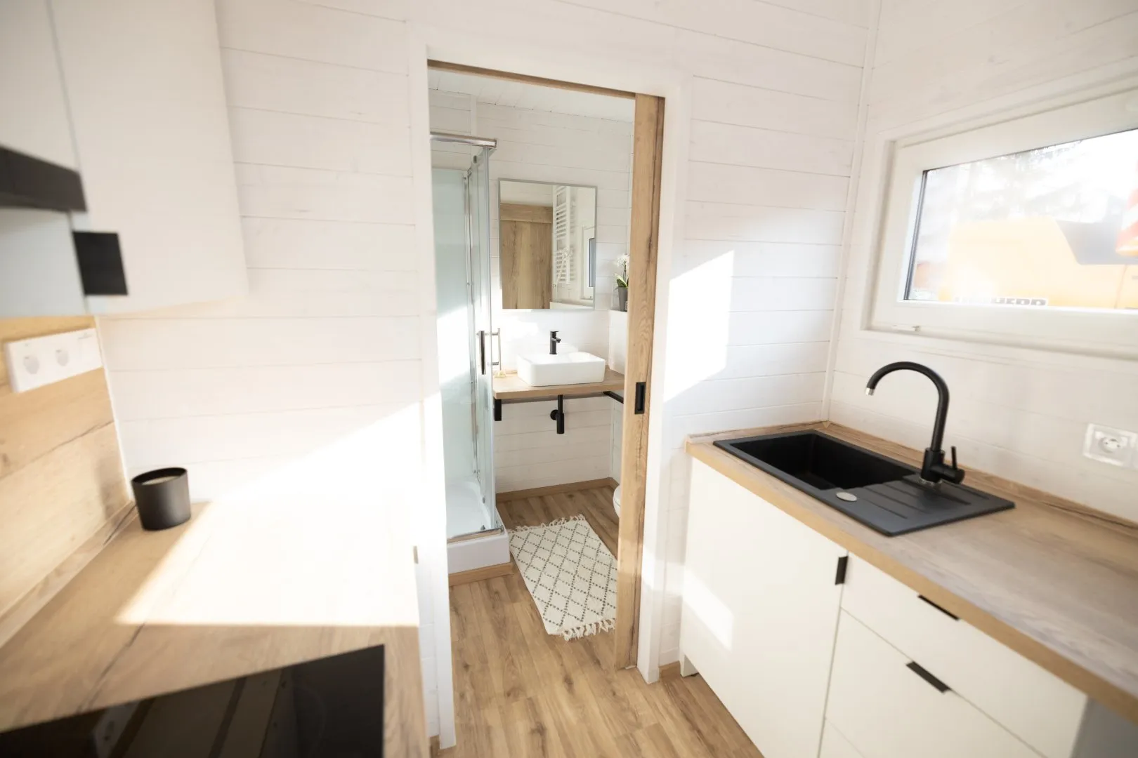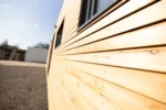 Casa contentor – uma cabana com painéis de madeira e mobiliário.