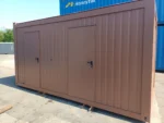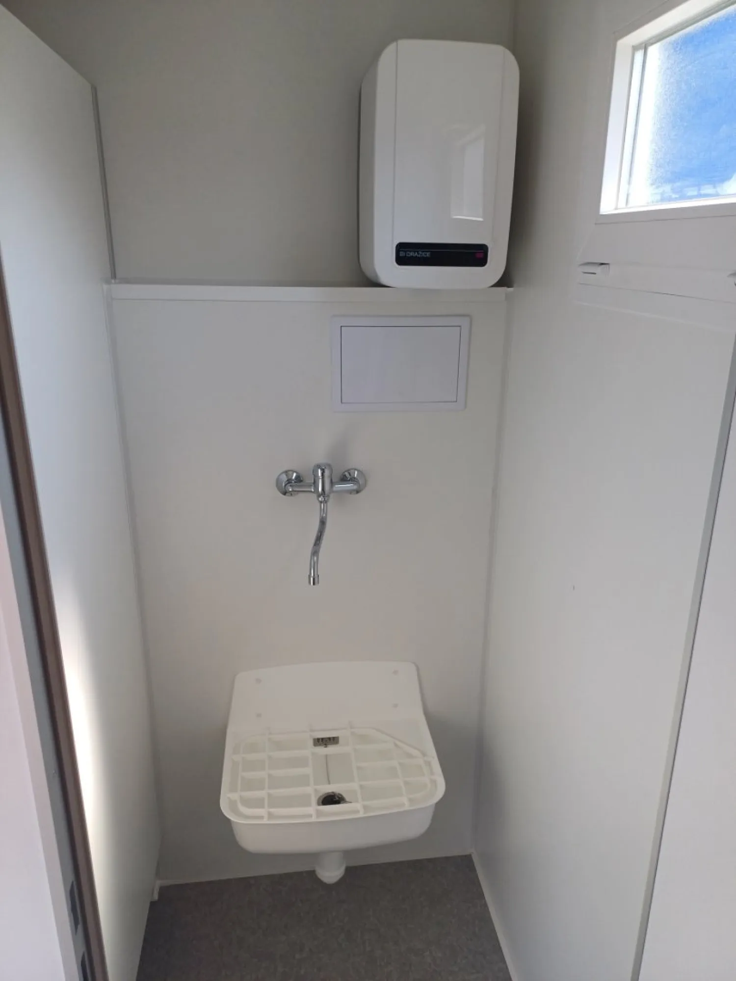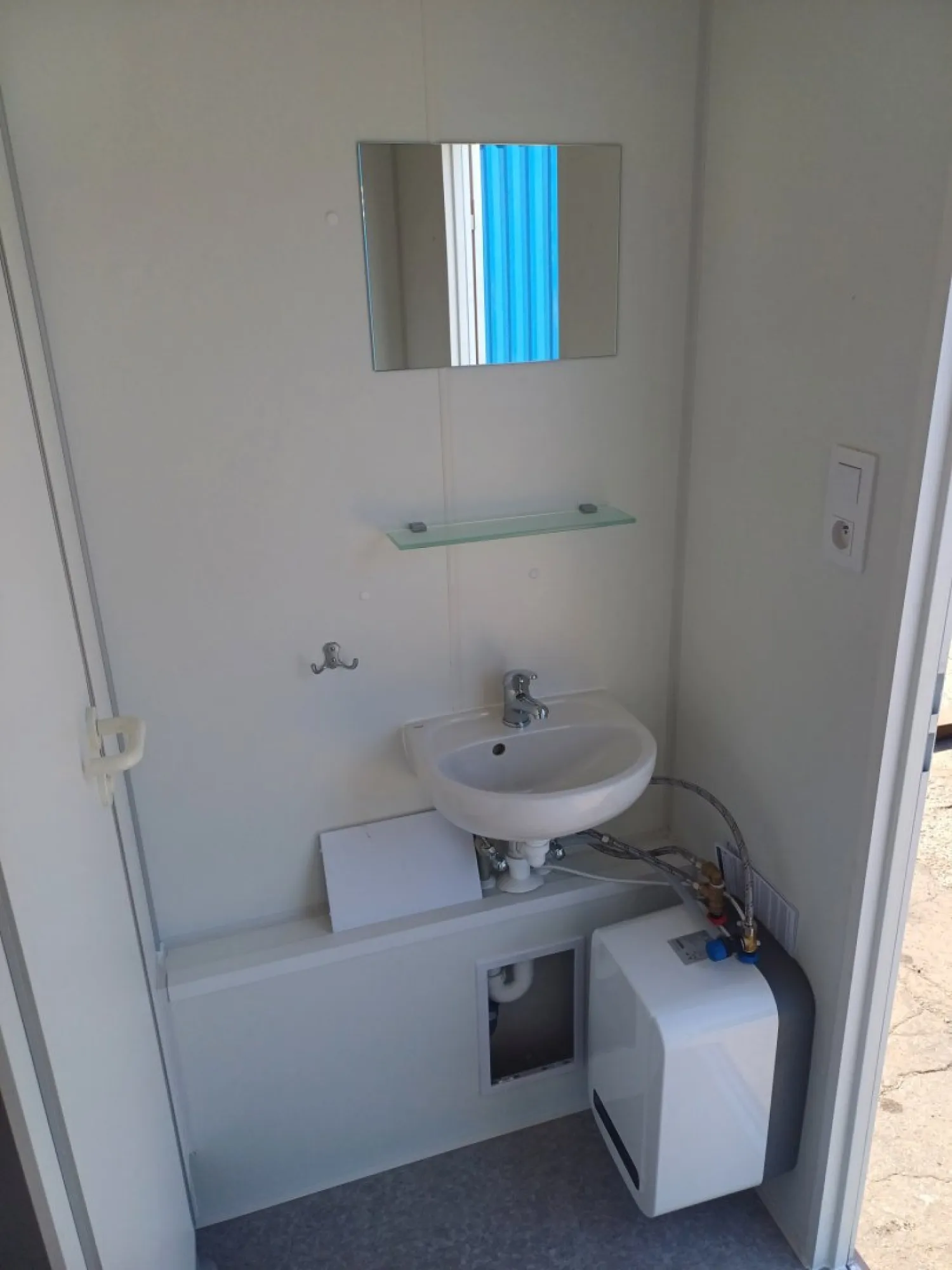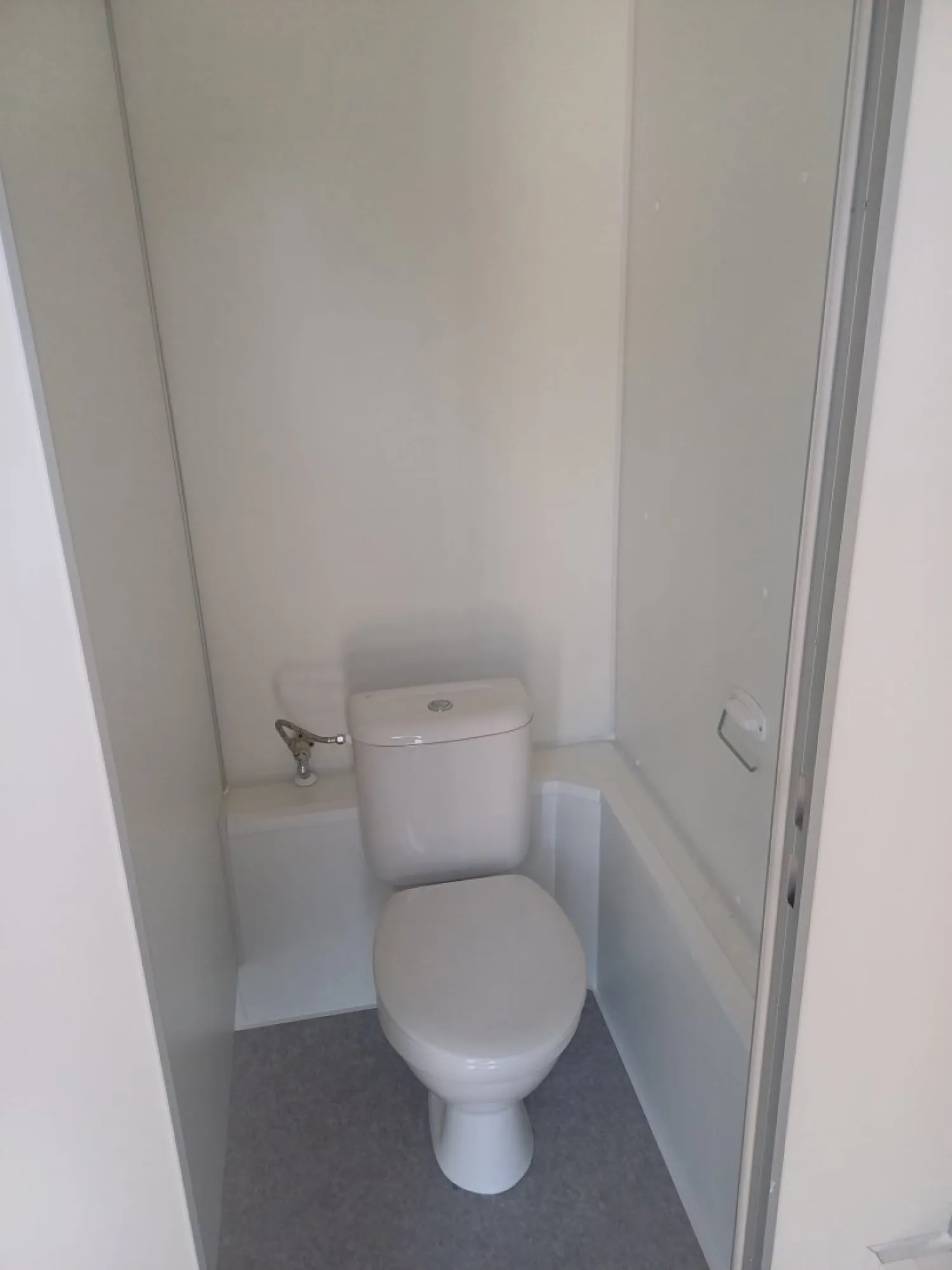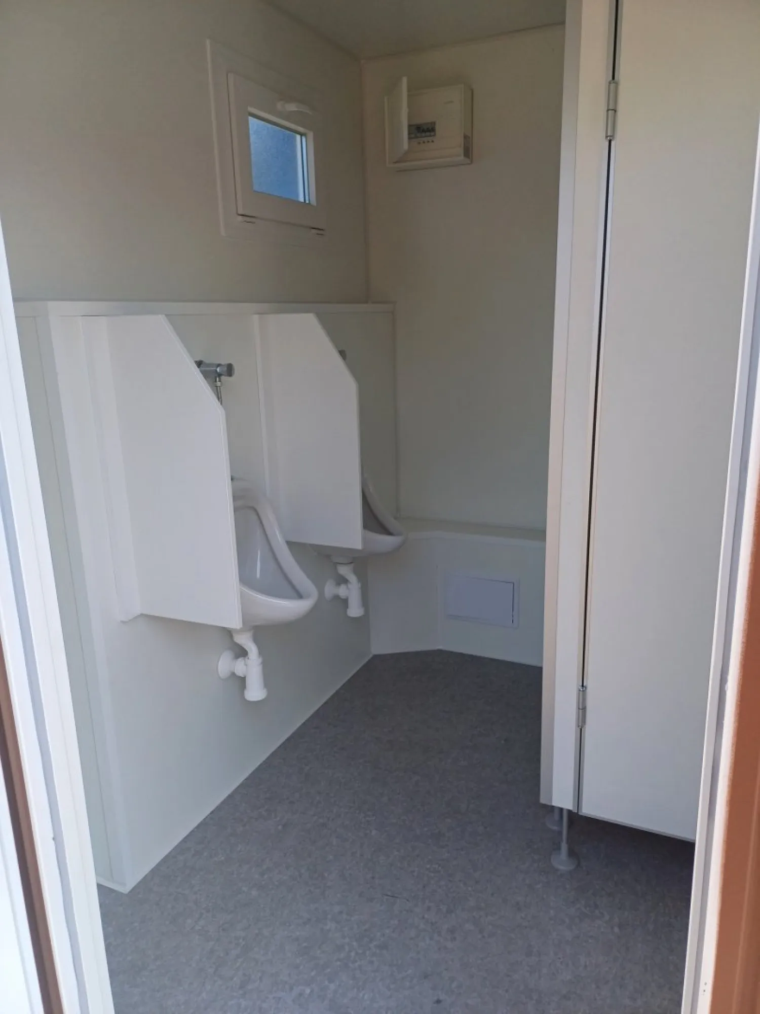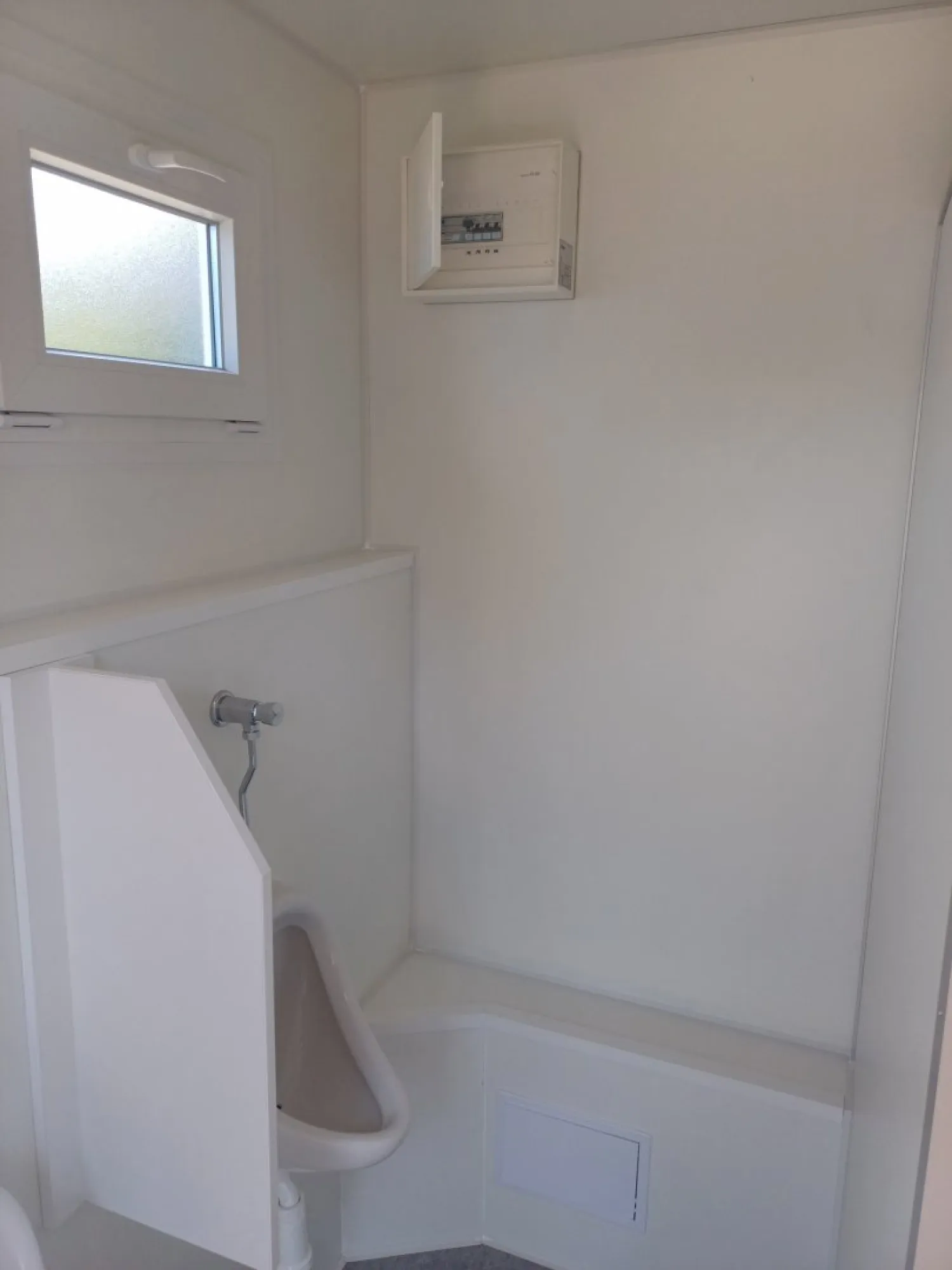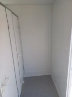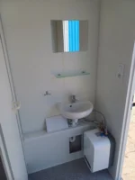 Cela sanitária equipada com cabines sanitárias e lavatório. A cela está dividida em duas secções com entradas separadas: uma para homens e outra para mulheres. A secção masculina inclui cabines sanitárias, lavatórios e um urinol. Existe também um lavatório na cela. Os canos de água e esgotos são embutidos para um aspeto limpo e organizado.